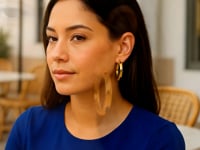 14k yellow gold wedding band hoops on a woman wearing a blue top.